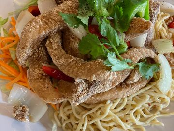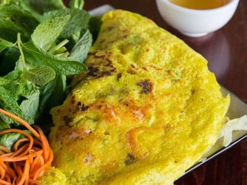 Ben Tre's Mama's recipe for crispy Vietnamese savory crepe. The filling consists of pork belly, shrimp, mushrooms, grilled onions, and bean sprouts nestled in a soft yet crispy tumeric spiced batter. Served with lettuce and herbs for wraps to balance the dish (vegetarian version available)