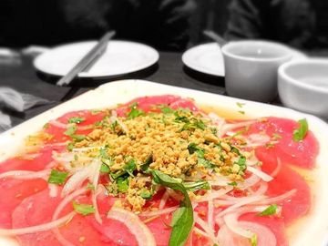 Vietnamese beef carpaccio; fresh and vibrant, topped with crushed peanuts, fresh herbs, onions, and crispy garlic lightly cooked with fresh limes. A must try for foodies! (GF)