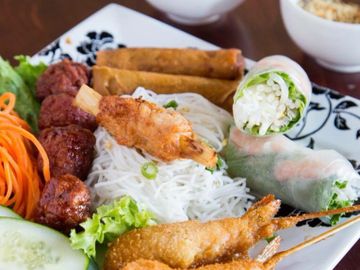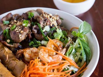 Char-grilled pork, crispy fried imperial rolls, sauteed shrimp, with picked veg and fresh herbs over refreshing vermicelli